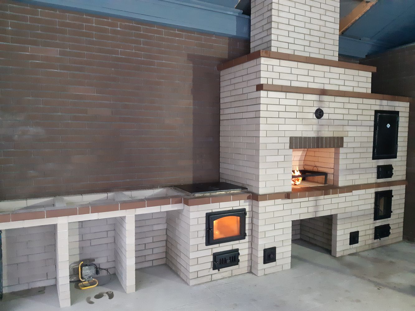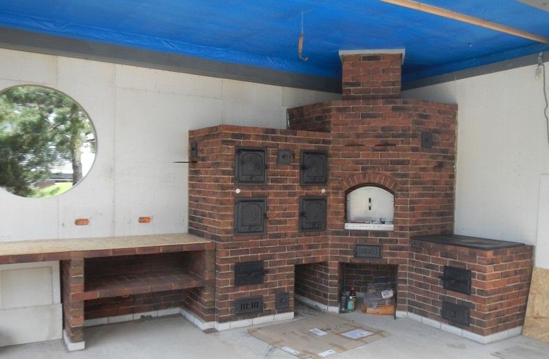 Справа хлебная печь, мангал, слева плита под казан. "ПарЯщие" вытяжки. Кирпич ручной формовки MUHR.